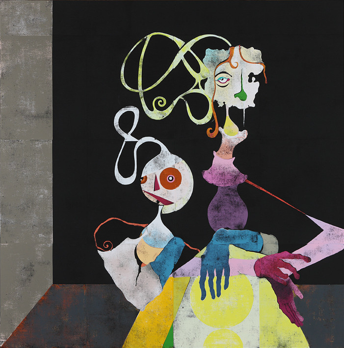 Identical twin brothers Gert & Uwe Tobias were born in Brasov, Romania, in 1973, in the Transylvanian region. Having moved to Germany in 1985 they studied in Brunswick, and now live and work in a studio complex on the outskirts of Cologne. They paint, sculpt, make traditional woodcuts and collages. They have worked together since 2001 and when in their studio the artists often complete each other’s work. Their work is full of strange characters and creatures drawn from eastern European folk art combined with diverse influences, from abstract art of the early 20th century to German post-war painting.