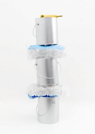 Chris Bradley, Stack (Ice Bags, Cans, and Bananas), 2014. Wood, glass, cast bronze, plastic bags, cut vinyl, and paint; 34 x 3 x 18 in. (86.4 x 7.6 x 45.7 cm) Courtesy of the artist and Shane Campbell Gallery