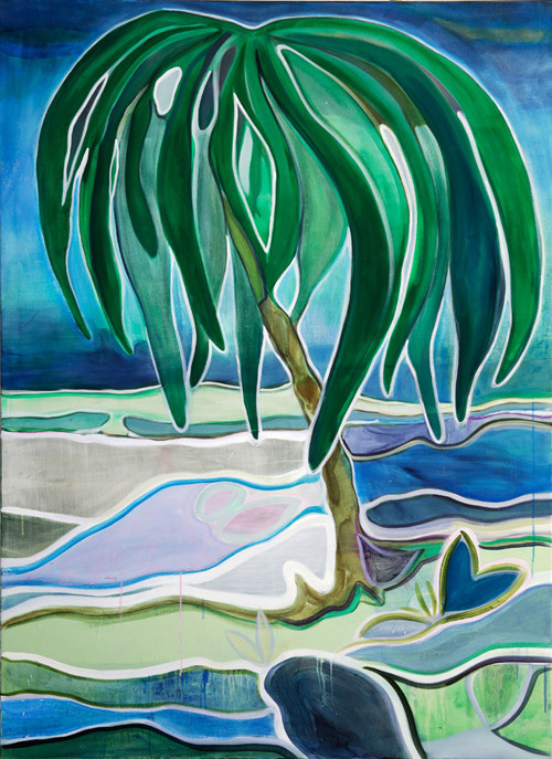whose trunk appears to be rooted amidst a flowing mix of land and water, set against an ombré blue sky. Hovedøya – inspired by the performative aspects of the French tableau vivant (living picture) and the German Freiluft-Theater (open air theater) – portrays a group of five people dressing up, a moment taken from a trip the artist took with friends to the small island of Hovedøya, outside Oslo. Other paintings show a forest community of tents and plastic covers, based on a temporary camp for homeless people in Nordmarka, Norway, and a friend of the artist observing nature. The abstraction of figurative motifs manifests a poetic reflection of personal journeys and is often characterized by volatile and transparent brush strokes. A combination of distorted landscapes, fragmented geometric shapes, and sinuous curves imbues each work with an otherworldly, dreamlike quality, effectuating an overall feeling of wanderlust.