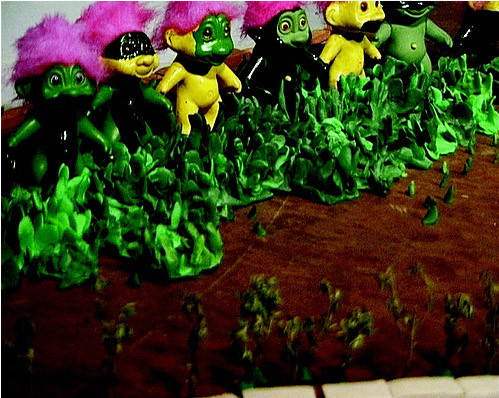 G G G & G is about the coming into existence from magical rituals performed by small colourful trolls, about the loneliness of the gangster in a world revealing its built-in fiction, about the green goddess’s lust for creation and destruction in front of a sterile civilization, about positive identity dissolutions as a strategy to welcome and form a larger reality, about the return to nature and the green and about the spider’s fantasy and the public’s fantasy and fantasy as a subversive force aimed against order and reason who threaten humour and human dignity with death.