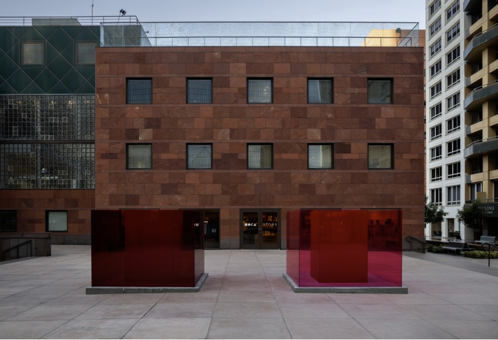 Bill and Coo at MOCA’s Nest extends Bell’s decades of experimentation with glass. With this work, the pioneering artist long associated with California’s Light and Space movement juxtaposes luminous reds in various saturations, the shades of which are lyrically called habanero, cerise, hibiscus, and carmine. The title refers to the protagonists of 1948’s Bill and Coo, a peculiar and delightful film whose cast is made up entirely of trained birds. The names of the film’s titular lovebirds were in turn drawn from an old-fashioned way to refer to the flirtations of young lovers: within the space of the Sculpture Plaza, a concave hollow defined by the surrounding forms of Isozaki’s architecture, the pair “bill and coo” while nestled in their home in the nest.
