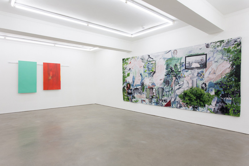 Laure Prouvost’s new tapestry Swallow me, From Italy to Flander, a tapestry (2015) unites her use of collage and scenography to create an intricately woven visual narrative. The painting Woman Upsidedown (2011) depicts a naked woman hanging in the middle of an unclear landscape accompanied by an audio track in which her seductively broken English recounts a story of desire accompanied by a song by Elton John.