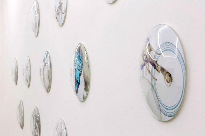 Also presented are works in which the artist has photographed details of glass objects; often richly coloured they appear as lucent, almost abstract forms. Yet by placing these images under convex circles of glass Sighicelli renders them unstable. Blurring distinctions between image and reality, the surface of the convex glass casts reflections of the surrounding room, changing as the viewer moves in the space. Sighicelli ‘un-fixes’ the photograph, playing with the dynamics of perception by folding the actual into the pictorial.