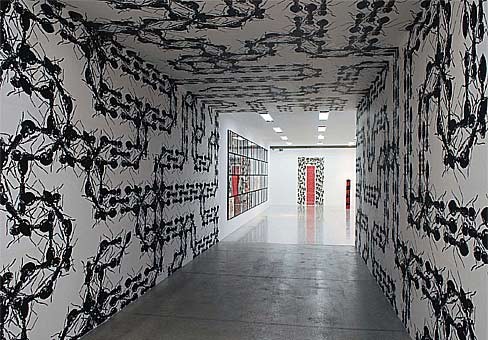 At the beginning of the 1980s Peter Kogler began to use media and computer technology as the basis for his installative works, confronting and blending the perfectionism of the new technologies with physical and organic motifs. This differentiated him from the mainstream of Neue Wilden painting. Simple basic modules such as an ant, brain, rat or pipe (which are then serially reproduced) have become succinct identifying features of his works. The art work is no longer only an object on the wall but, rather, architecture and public spaces become mediums for impressive, large-scale works. Thus the artist transforms galleries and museum rooms as well as railway stations and public spaces into virtual labyrinths which at times contain infinite and bottomless spatial perspectives. These appear to change dynamically (as is the case with the central installation in the exhibition) and provide visitors with new spatial perceptions.