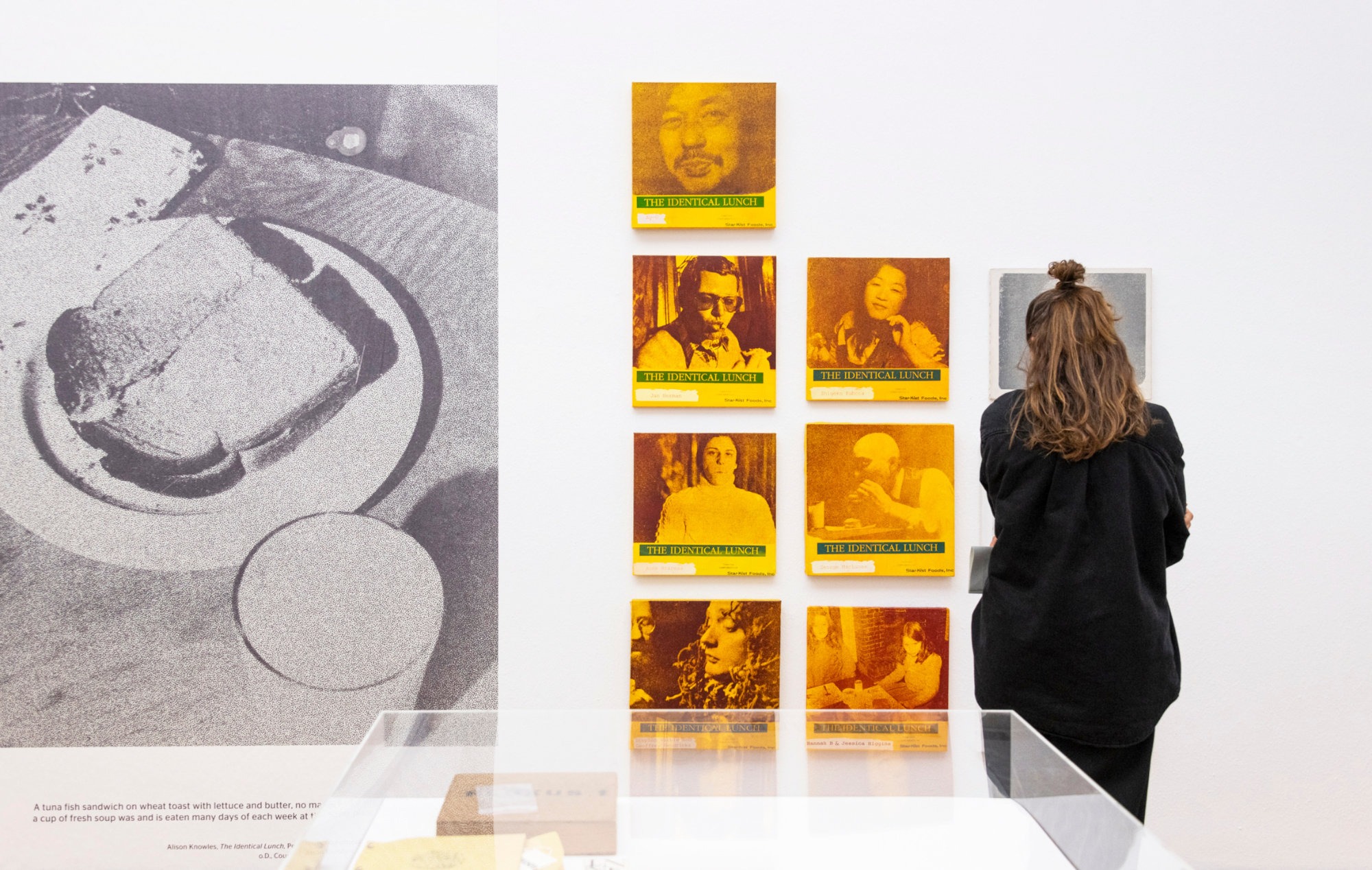 Besucherin vor Alison Knowles‘ The Idential Lunch © Alison Knowles. Foto: Museum Wiesbaden / Bernd Fickert