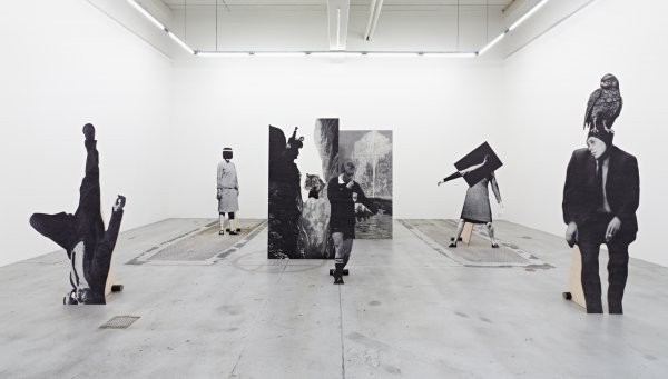 In the tradition of 19th century dioramas and amusement parks as well as modernist theatre set design, the works create a scenography that represent a vivid world, producing a stage that can literally be entered. In the same vein, the immersive quality of this world shows itself to be deceitful, as once the spectator moves within the installation the sculptures expose themselves to be one-dimensional. Made from wood cut-outs, the sculptures' fronts are adorned with black and white imagery while the backs are left untouched, apart from the basic supports that hold them. Some of the imagery is created through various collage elements, while with other works the simple gesture of a change in size, context or direction is the only intervention. The use of scale and position contributes to a sense of uneasiness, as it alters our preconceived notions of space. Intervening on the sculptures by changing or adding certain elements forces the spectator to bridge the gap between the way that the image is habitually presented, and the way that the image is experienced in this space.