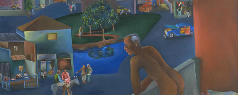 Bhupen Khakhar (1934–2003) played a central role in modern Indian art and was a recognised international figure in 20th century painting. Active from the 1960s Khakhar was part of a lively new wave of narrative painting and figuration by artists in India that became known as the Baroda School. His practice evolved from the careful study of art from South Asian and European sources, even while he continued to work as an accountant part-time. After early experiments with Pop art Khakhar developed a style of painting that combined both high and low, popular and painterly aesthetics, cleverly subverting popular iconography. He confronted complex and provocative themes with candour: class difference; desire and homosexuality; and his personal battle with cancer. Also a writer, his critical observations and literary sensibility were evident in his sharp, often ironic depictions of difficult subjects.