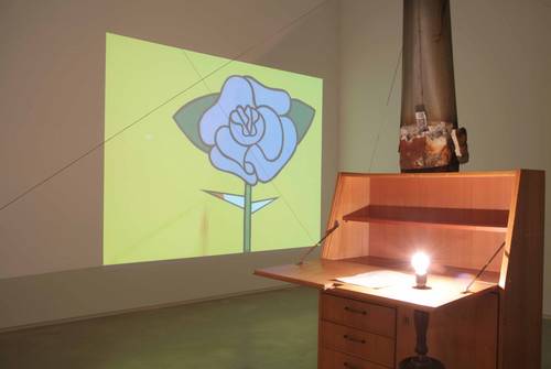 An empty writing case and a video projection present “la rosa de la canción protesta” (“the rose in the song protests”) constantly dripping “blood” that is accompanied by a piano musical composition under the installation same title composed by the Cuban author Ernesto Lecuona. On top of the writing case, a note: “we produce more roses than traitors”.