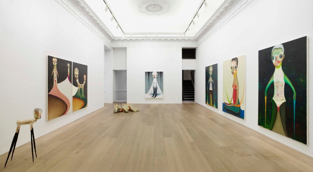 In 2005 Kato also turned to sculpture. Deliberately avoiding materials that are easy to mould such as clay and resin, he works only in wood, carving directly. Once again he focuses consistently on human figures, chisel marks and cracks left like idiosyncrasies of the flesh. That he always colors these roughly hewn bodies indicates that for Kato, they are in extension in his painting. Some of his works are equipped with legs or castors resembling those on desks and chairs.