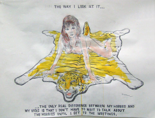 Using humor and self-deprecation, David Kramer frames everyday experiences and juxtaposes them against the idealized expectations of life that come out of the pop cultural cannon to create his stories, drawings and sculptures. Like a fly to the hot lights, Kramer is attracted to the glossy images and advertisements from lifestyle magazines knowing that, even if he can fulfill his desires, he will still find himself sadly disappointed only to desire something else.