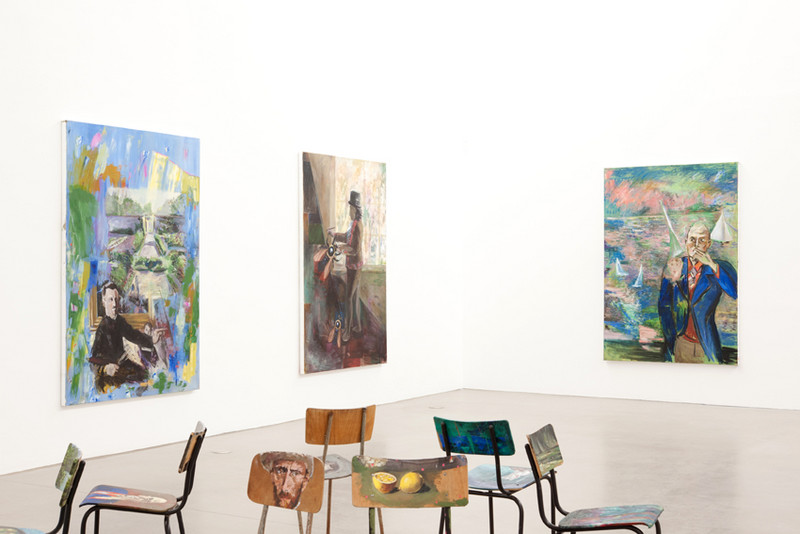 The main gallery space introduces a group of new paintings. Mainly large canvases in cool blue hues, they portray teetering sailing boats, traditional interiors, still lifes of fruit, carcasses, flowers, and the great European painters of the 19th and 20th century, the wake of modernity: Gustave Caillebotte, Max Beckmann, Goya, van Gogh. Von Wulffen spent the past couple of years returning to books, studying illustrations of French, Dutch, and German paintings from this era. Apart from amateur techniques such as batik, silk painting, dipping lacquer, appliqués (like sand or seashells), or the quick spatula technique, which can be associated with current times, there is nothing in these paintings that actually depicts the contemporary world. However, Amelie von Wulffen does not merely reference specific historical art works, or create a persiflage of the history of painting. This history effectively becomes an intricate fragment within her own artistic work. In recreating self-portraits of painters standing in for the canon of modern art history, she enters into the intricacies inherent in the act of these artists painting themselves. It relates to a deep admiration for their work and an intimate fascination with the way they see themselves as painters and as individuals – something that occurs in her own work since the early beginnings.