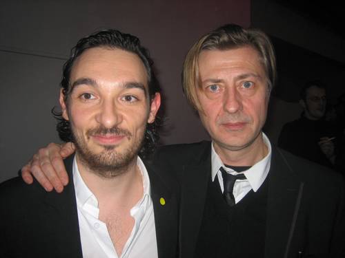 Left: Jérôme Sans with fashion designer Jean-Charles de Castelbajac. Right: Model and photographer Astrid Muñoz with "Notre Histoire..." artist Matthieu Laurette.