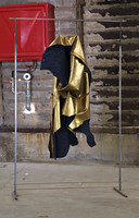 Two canvasas / black ink on canvas folded and reversed, leather implements, one silver chain, two spraypainted feathers,