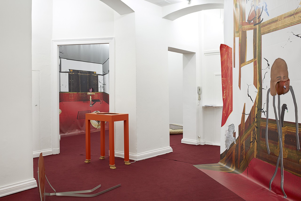 There will also be two metal sculptures with large heads made from printed aluminum that are reminiscent of stick figures, which can be read as bored waiting customers, perhaps dwindling away from the ridiculously long waiting time. Five animated videos with sound will be interspersed throughout the gallery, lending the exhibition some visual and aural dimensionality. In one of the videos, a voice can be heard talking to a customer service agent, who is not being at all helpful, but who turns out to be the inner voice of the customer himself—despite this, there is constant miscommunication between the two. Another of the videos will show a knife moving quickly between the fingers of a digitally drawn hand—a sick game called five-finger fillet that can be seen on YouTube. A third video shows a slightly moving dog (underneath a yawning human-dog animation) on a screen embedded in a dog bed, alluding to a dead guard dog found at the ruins in Pompeii.