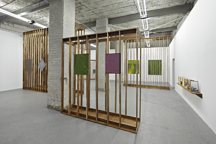 To underline the artist’s and the work’s presence in the space, the painting and colour studies shown at PSM are mounted on custom-made wooden structures that are not themselves part of the work. These “display units” - a term used in a number of works by Aasan since 2005 - frame the work in a way that multiplies the element of the grid. The structures make it possible to look and combine several works at the same time, from the same point of view. A helpful fact to the viewer to understand the principles the artist established to research in his studies: to copy already existing paintings, produce several new ones from each “original” work, and by doing this trying out pictorial conventions like scale, cropping, exchanging foreground/background, picture in picture or turning the composition.