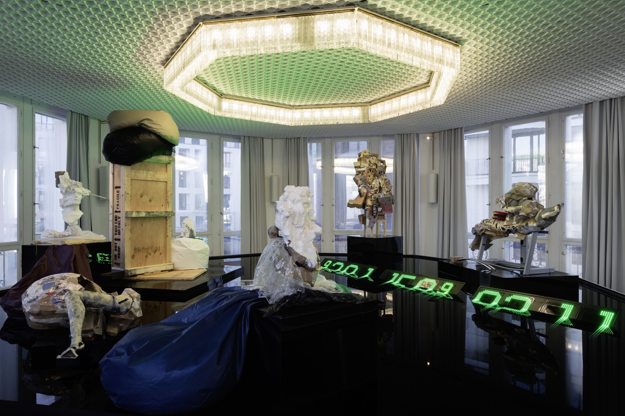 Upon the plateau of a room-size indoor bassin, life-sized sculptures of clay, papier-mâché and wood fuse the faces of Bowie and Barboza into fragmented chimeras. A digital clock submerged in the water, a running countdown and the sensual element of water become symbols of the coveted union. The absence of Bowie exposes the fulfillment of Barboza’s longing as a phantasm. Instead, the pop idol is stylized into an object of desire, upon which, emotional and physical intimacy is lastly projected. In her tableau of alter-like sculptures and elements of arranged hyper-realism, along with ready-made objects and portraiture, Barboza alludes to human loss and psychological fragmentation, critically questioning contemporary popular culture.