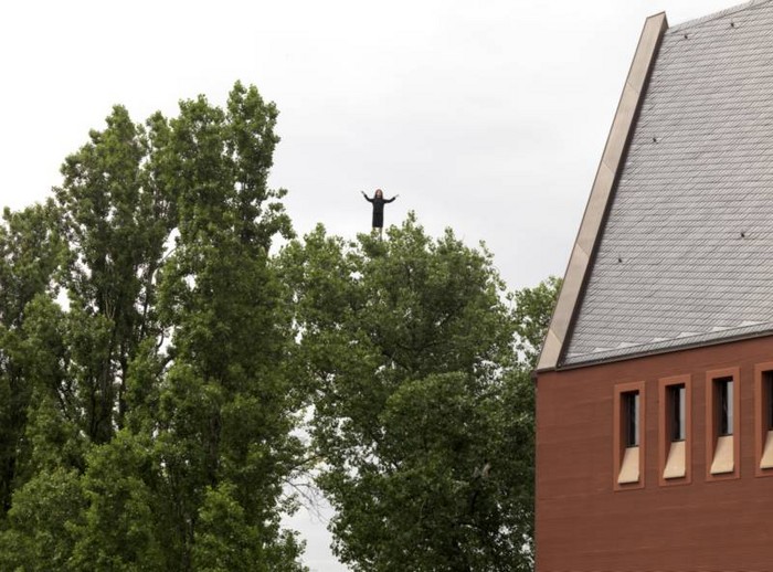 Far up in the sky, above the trees, behind the Portikus, this woman hovers in the air.