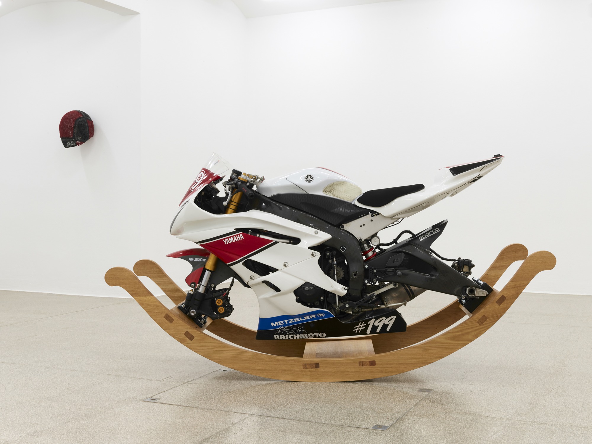 Things retaining their autonomy while being transferred into new contexts is the hallmark of Bircken’s approach of appropriating artifacts and fabrics. By interweaving a multitude of elements, the artist assigns them unwonted and often disconcerting identities. The encounter between disparate objects defines the conception behind her exhibition as well as the complexion of individual sculptures. For example, Bircken has mounted a Yamaha R6 racing bike on curved wooden rockers instead of the wheels. The powerful machine seesaws back and forth like a rocking horse but goes nowhere, despite its fully functional engine. Bircken harnesses the physical and sensual qualities of her material assemblages as well as their symbolic dimensions to elicit sometimes contrasting chains of associations: the motif of the machine as an instrument of power and vehicle of an ecstatic sense of freedom is interlinked with connotations of childhood, craftsmanship and the organic.