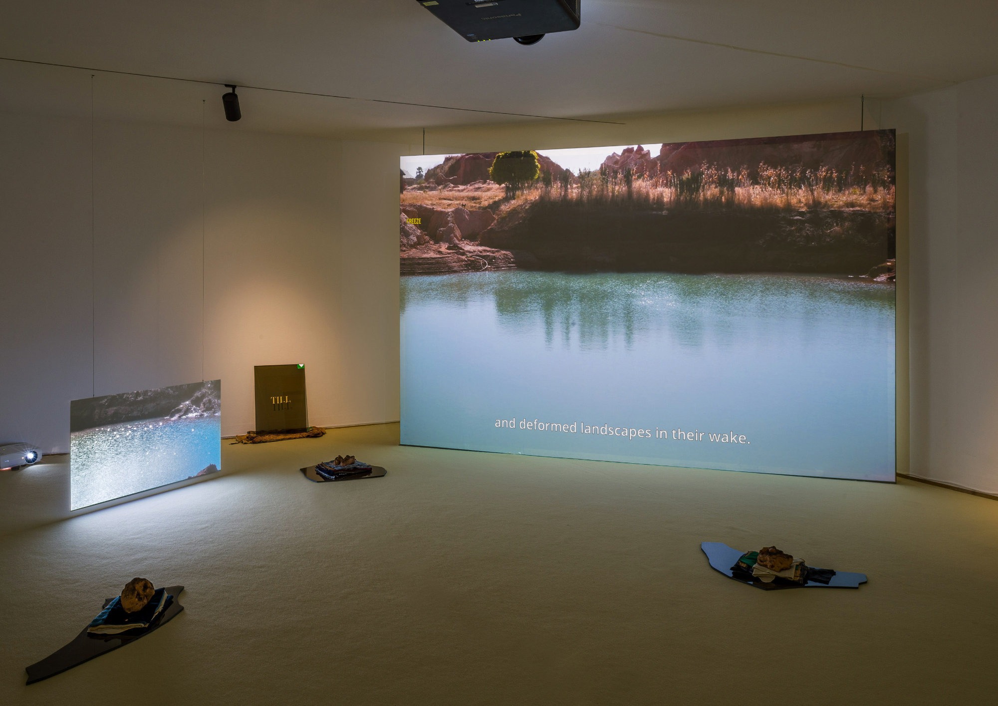 For the Secession, Ashadu has developed an installation that revisits and condenses various aspects of the film. Her poetic editing technique, which lets her orchestrate diverse voices, is further enhanced by the conceptual realization as a two-channel work. Brief sequences that suddenly flash up on the small screen repeatedly disrupt the narrative flow with close-up shots of hands or feet buried in mud, confronting the viewer with alternative viewpoints.