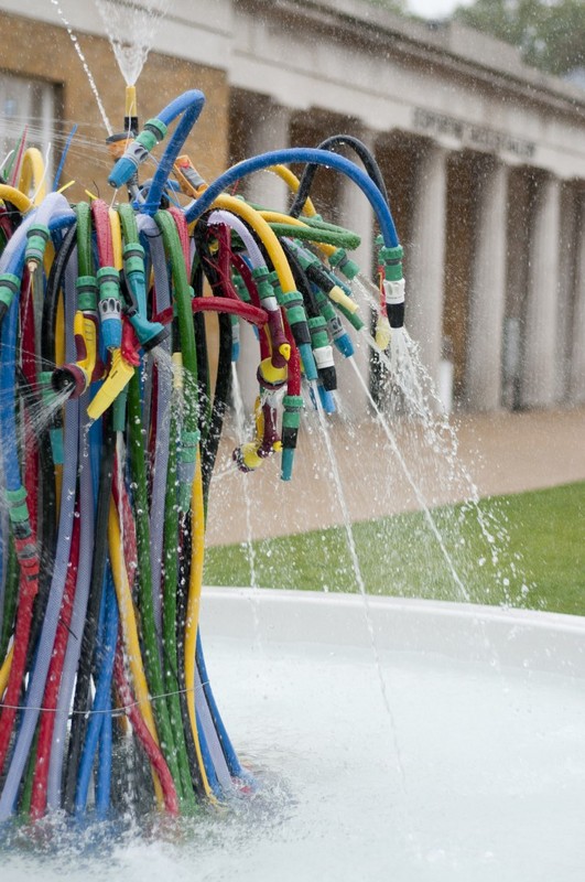 Bertrand Lavier’s Fountain is a playful interpretation of this most traditional of garden features; instead of a classical sculpture of a figure or natural form, the jets of water emanate from an apparently unruly mass of garden hoses. The bright colours and mass-produced forms of the hoses and nozzles appear in stark contrast with both the neoclassical façade of the Serpentine Sackler Gallery and the smooth lines of The Magazine restaurant, designed by Zaha Hadid.