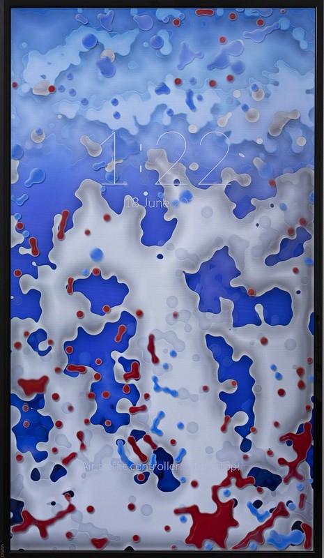 Drinking Bird Seasons, 2015 is a new single-channel video work by Tabor Robak. It displays an abstract landscape of colours and patterns suggestive of a smart phone’s lock screen. The continuous stream of Computer Generated Imagery animation is overlaid with an electronic phone clock showing the passing of days in compliance with the Gregorian calendar. It is juxtaposed with fictional holidays and constant live news updates. This internet-enabled animation serves as a commentary on the intrusiveness of digital information and the reliance on technical devices.
