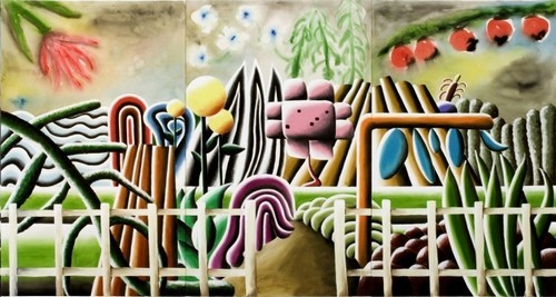 Dominating the exhibition are two large-scale paintings which typify Schulze’s vibrant and powerful visual style. While stylistically Schulze’s paintings have often echoed and indeed drawn on a Modernist painting tradition which stretches back to artists such as Giorgio de Chirico, conceptually and attitudinally his work is suffused with the postmodern sensibility of his contemporaries. Colourful and curiously somber, Schulze’s acrylic on canvas paintings evoke the melancholia attendant on the dislocated and fragmented nature of contemporary experience. Void of human figures but often featuring motifs which sometimes allude to, and sometimes directly represent, domestic and everyday objects, the paintings point towards fantasies of lost comforts and homes confiscated by a threatening and alienating world.