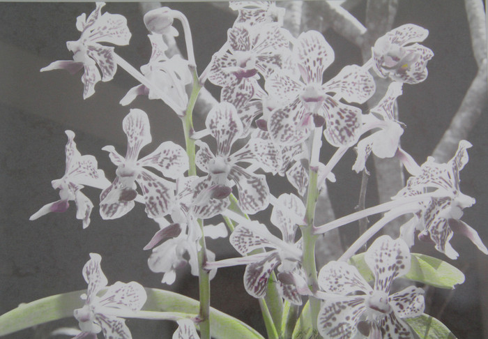 Using crayons, Vanessa van Obberghen adds artificial color to black-and-white photographs of exotic flower blossoms and human models. She displays these pictures next to drawings of genealogical trees and strands of DNA she realizes in a deliberately playful fashion rather than copying them strictly from scientific sources.