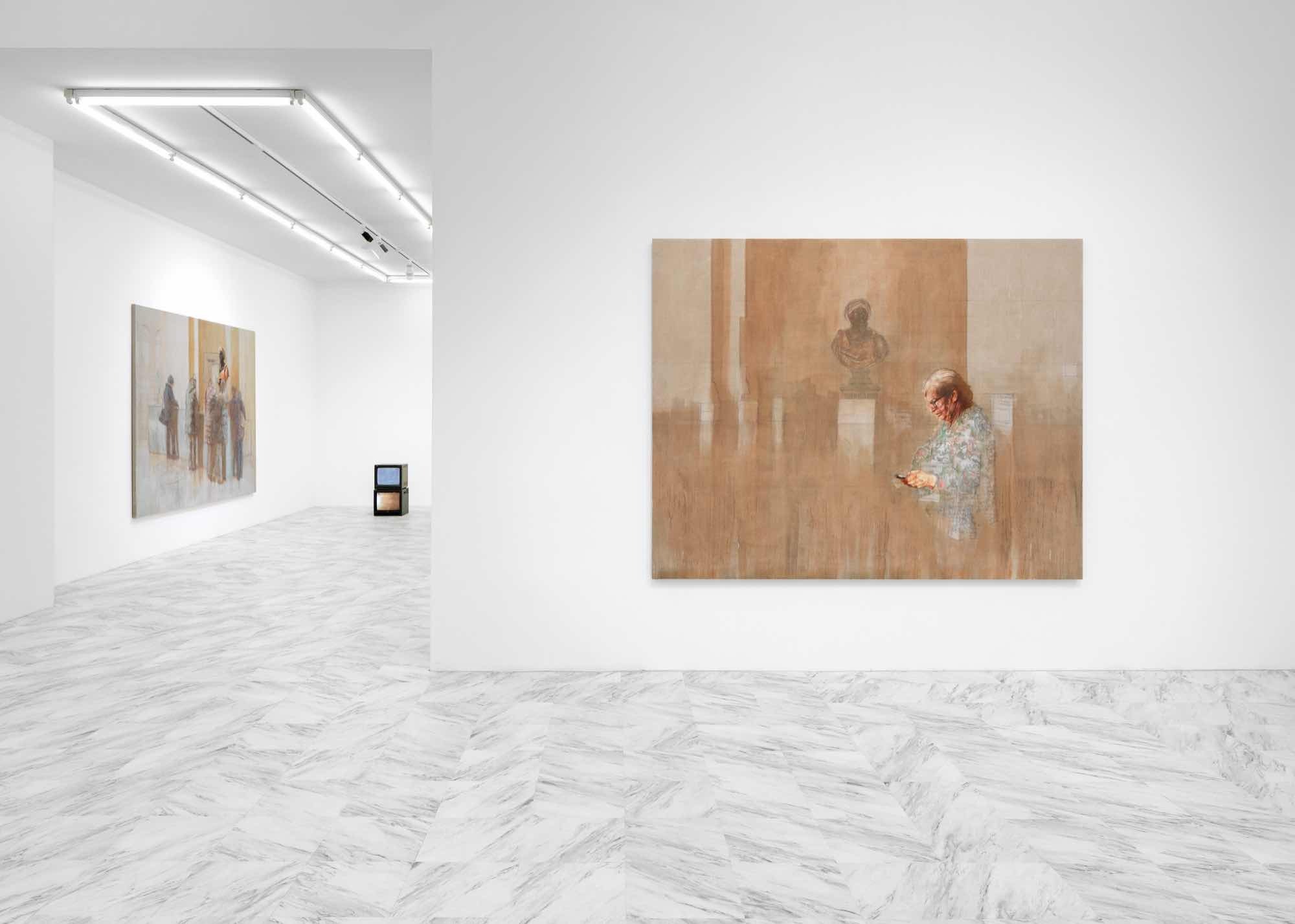 In his paintings, the nineteenth-century architecture of the building crowded by busy museum-goers, appears faintly, in broad and soft washes of pink and sienna tones that evoke the marble that covers the room. In sharp contrast, the busts appear in full colour in a hyper-realistic fashion. Jefferson is interested in portraying “the serendipitous visual encounters between the museum’s employees and visitors and these two busts”, which becomes apparent in two new paintings selected for this exhibition that enact a significant change of strategy. One visitor, an older white woman taking a photograph of one of the busts, is rescued from the tanned, washed background, painted in full detail as well. The inspiration behind ‘Flâneuse’ (2020) is subtle but specific: it echoes Gerhard Richter’s ‘Betty’ (1978), in which the celebrated German painter’s daughter is portrayed similarly, and which itself, converses with Johannes Vermeer’s ‘Girl with a Pearl Earring’ (1665). With this gesture, Jefferson, born in 1989, and whose artistic language is completely contemporary in forms and concerns, continues the ongoing dialogue between artists of all times, defining his multidisciplinary practice as an offshoot of painting. The installation at the gallery is completed by a ‘marble’ floor (a cheap linoleum which humorously versions this noble material, a staple in institutional buildings), and two stacked CRT monitors, one playing a tourist-style video showing a walk through the lobby, and the other, close-ups of wall labels at the museum, informative and well researched in most cases except for the busts.