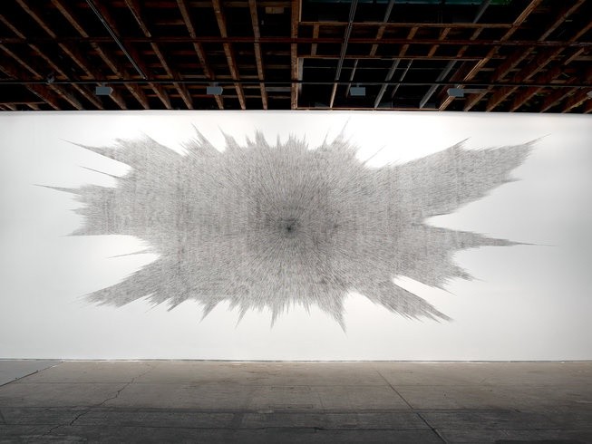 Khan's work is a continuous process of creating and erasing, or adding new layers whilst retaining traces of what has gone before. The large wall drawing, which will be created by the artist in situ in the gallery's upper floor over a period of a month will consist of more than 120,000 lines of text, again forming a giant radial form.
