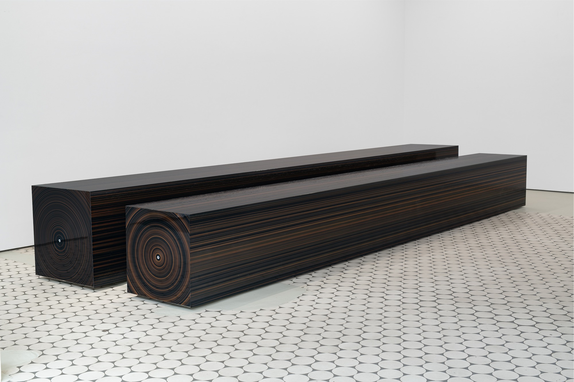 There are numerous references to the material wood in Hildebrandt’s work. It contains references to artists in the borderland between pop art and minimal art like Richard Artschwager, and at the time it also harks back to an early work from 2003. In one of his very first works, Hildebrandt declared disks of spruce wood to be records, and instead of grooves in vinyl, here the tree rings stand for the sound.