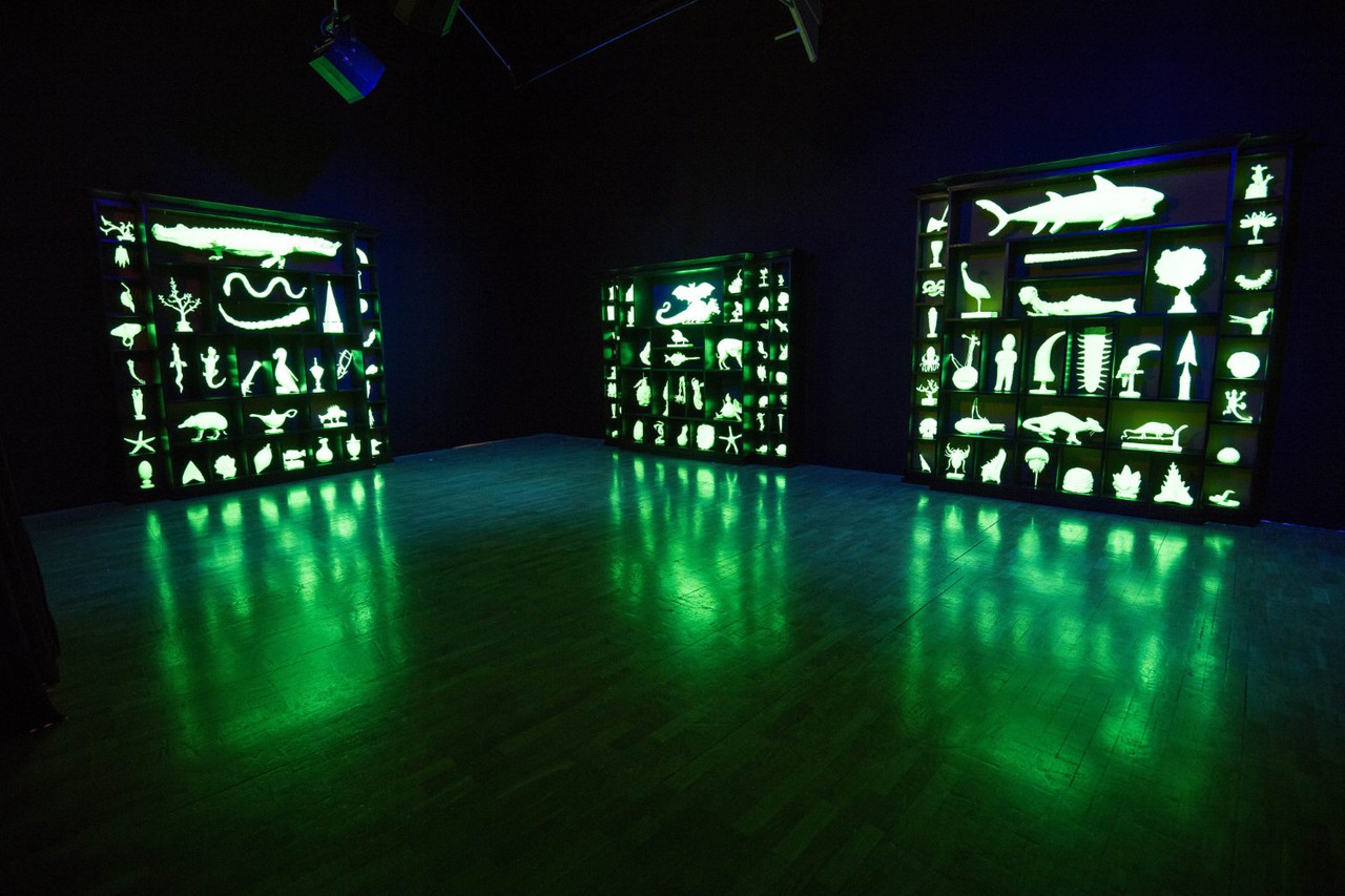 We embark on a journey through a sequence of installations created between 2000 and the present. The exhibition begins with The Library for the Birds of London (2018), a new commission continuing a series of aviaries Dion has created since 1993. The roomy sanctuary is a temporary home to 22 zebra finches, which are well-known for being social creatures. Visitors are invited into the aviary, which has an apple tree at its centre, referencing the tree of life. Over 600 books devoted to ornithology, environmentalism, literature and the natural sciences surround the birds. A scholar’s study invites us to unravel intricate drawings and models; while the Bureau for the Centre of the Study for Surrealism and its Legacy displays the strange magic of obsolete things. The muddy banks of the Thames have also yielded their treasures for poetic display in a gigantic cabinet; while The Wonder Workshop displays the ghosts of animals and instruments, many of them extinct and obsolescent. Each immersive environment is also a habitat, evoking the characters that observe, conserve or exploit the natural world.