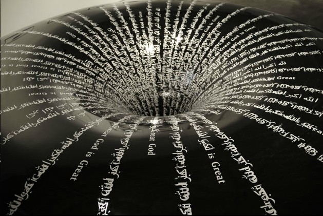 Idris Khan employs literary text, digital photographs, and musical scores to create works that call into question modes of appropriation, religion, authorship and abstraction. Khan’s artistic practice follows patterns and rules that blur the rigid cultural boundaries between the secular and spiritual. History and culture are the building blocks for his art, as he layers original images over each other to make a single work that reveals the texture and delicacy of the subject. For The Devil’s Wall, Khan will exhibit new sculptures based on his interest in the ritual and solitude of the stoning of the Jamarat, an aspect of the Hajj pilgrimage to Mecca made by millions of Muslims each year. During this act, pilgrims chant and throw seven stones at three walls in three different locations, with each wall representing the devil. Although this experience is a communal one, the pilgrims are encouraged to turn their attention inward, through contemplation and meditation, to rid their spirit of impure thoughts, which ultimately brings them closer to the divine. For these sculptures, Khan removes the three walls, leaving only the circular dish in which the stones gather after hitting the wall. The gesture of throwing is paramount in this work as the artist focuses on the transference of thoughts into objects and text. Khan represents this evolution by embedding traces of words into the object’s surface and having the words subtly disappear into the central vortex of the sculpture.